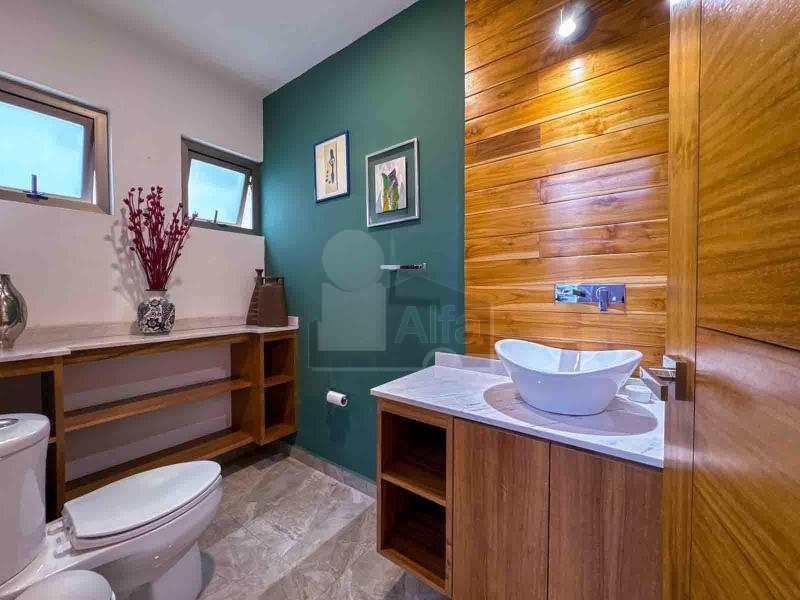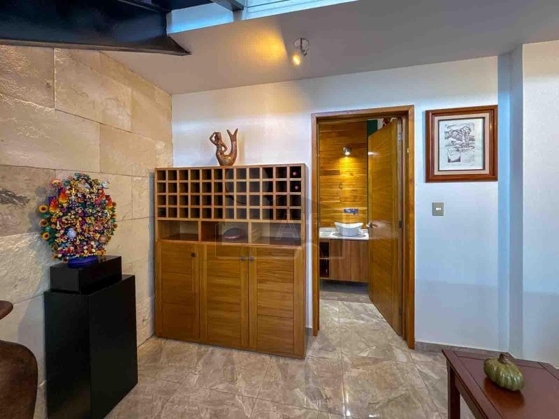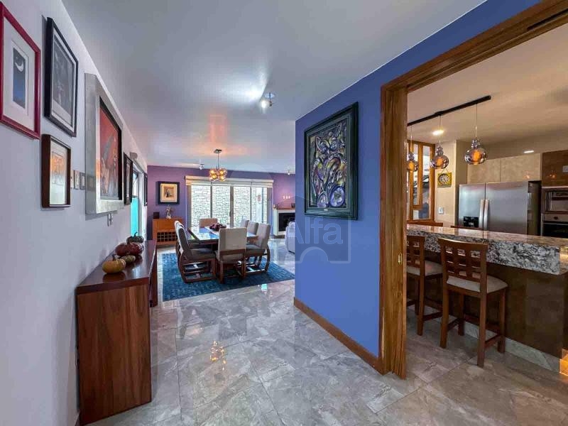 Al acceso se encuentra el estudio, seguido de la cocina de estilo mexicano contemporáneo, que puede a su vez funcionar como un bar, detalles de carpintería en parota, equipada con su estación de Coffee-bar. Comedor con vista al jardín, sala con chimenea y antes de subir la escalinata se puede observar la cantina y el medio baño.