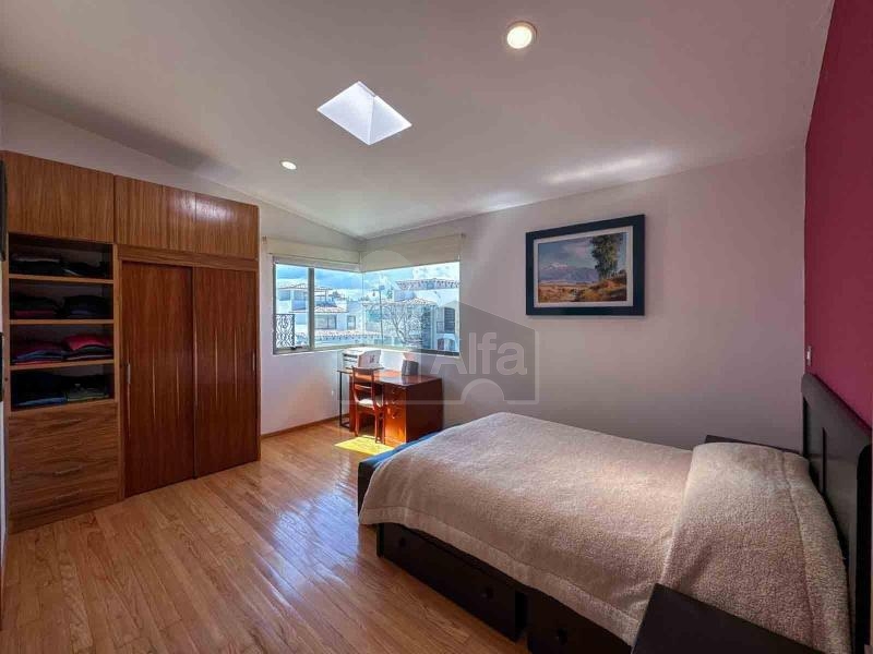 Primera habitación secundaria de 4m por 4.5m, con loza inclinada, detalles de piso en pino macizo, vestidor de carpintería en parota, y baño completo.
